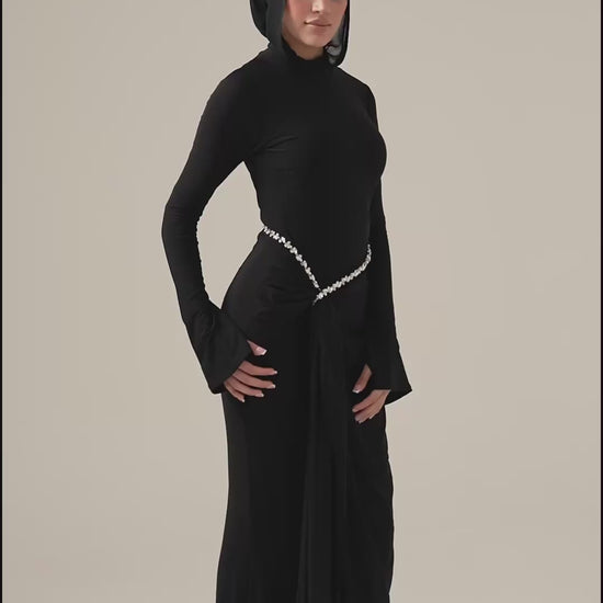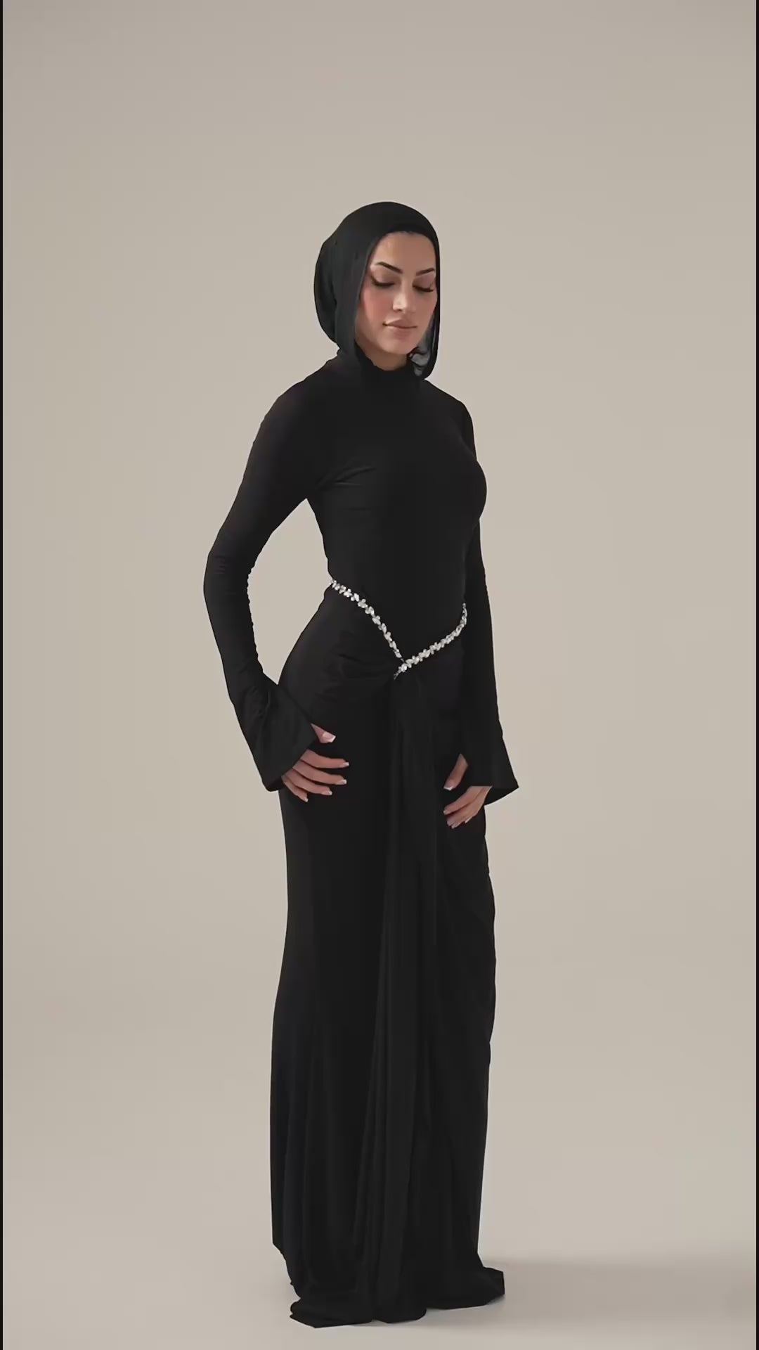 This gown is cut from panels of pure viscose jersey that drape fluidly along the frame, creating a statuesque silhouette. The waist is intricately crystal-stitched, forming a subtle, light-catching detail that elevates the piece into modern couture. A high neckline, floor-length finish, and seamless invisible back zip create a sleek, uninterrupted line, while thumbhole sleeves add a refined, contemporary edge. Available in Royal Blue and Black
