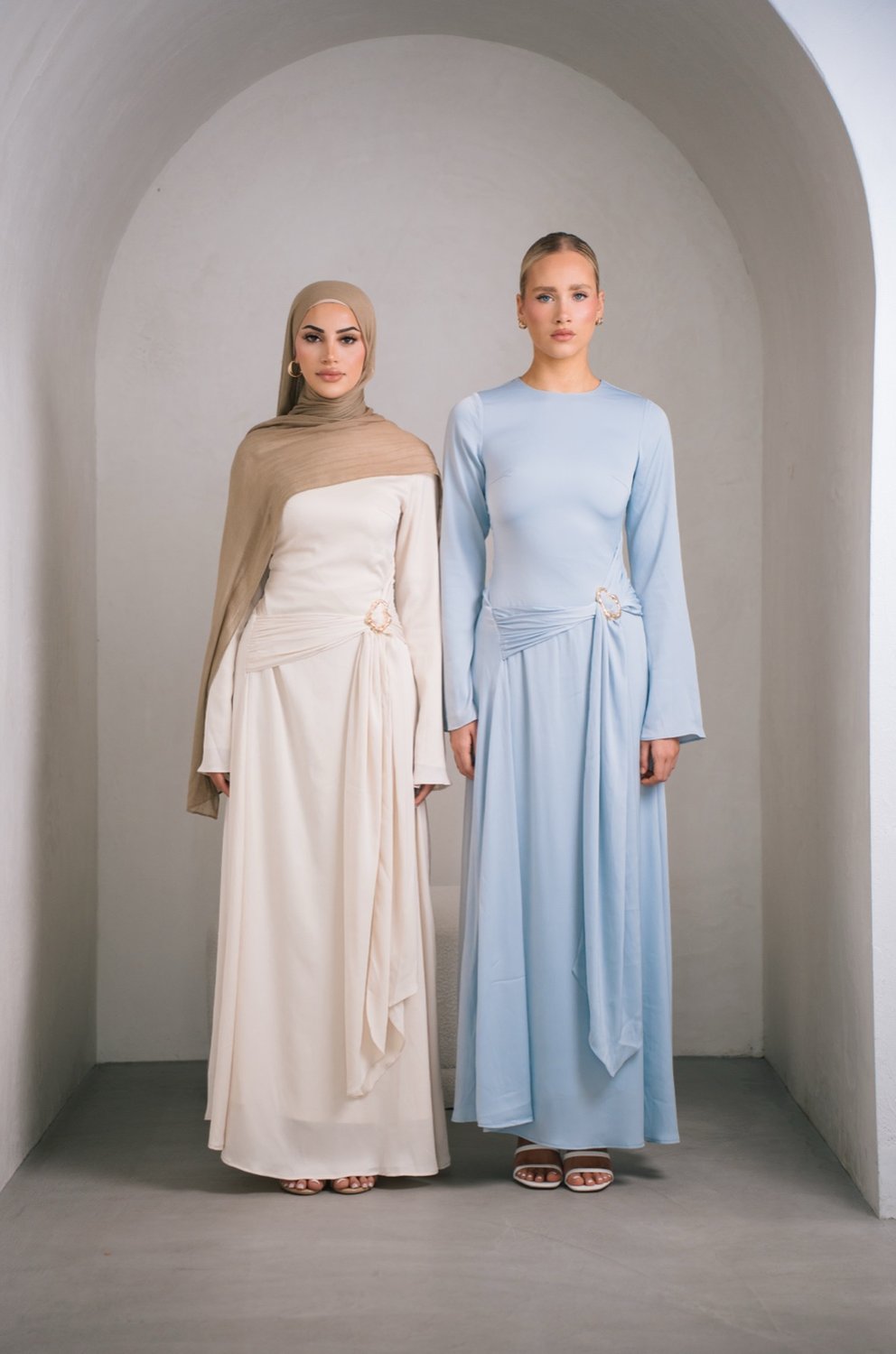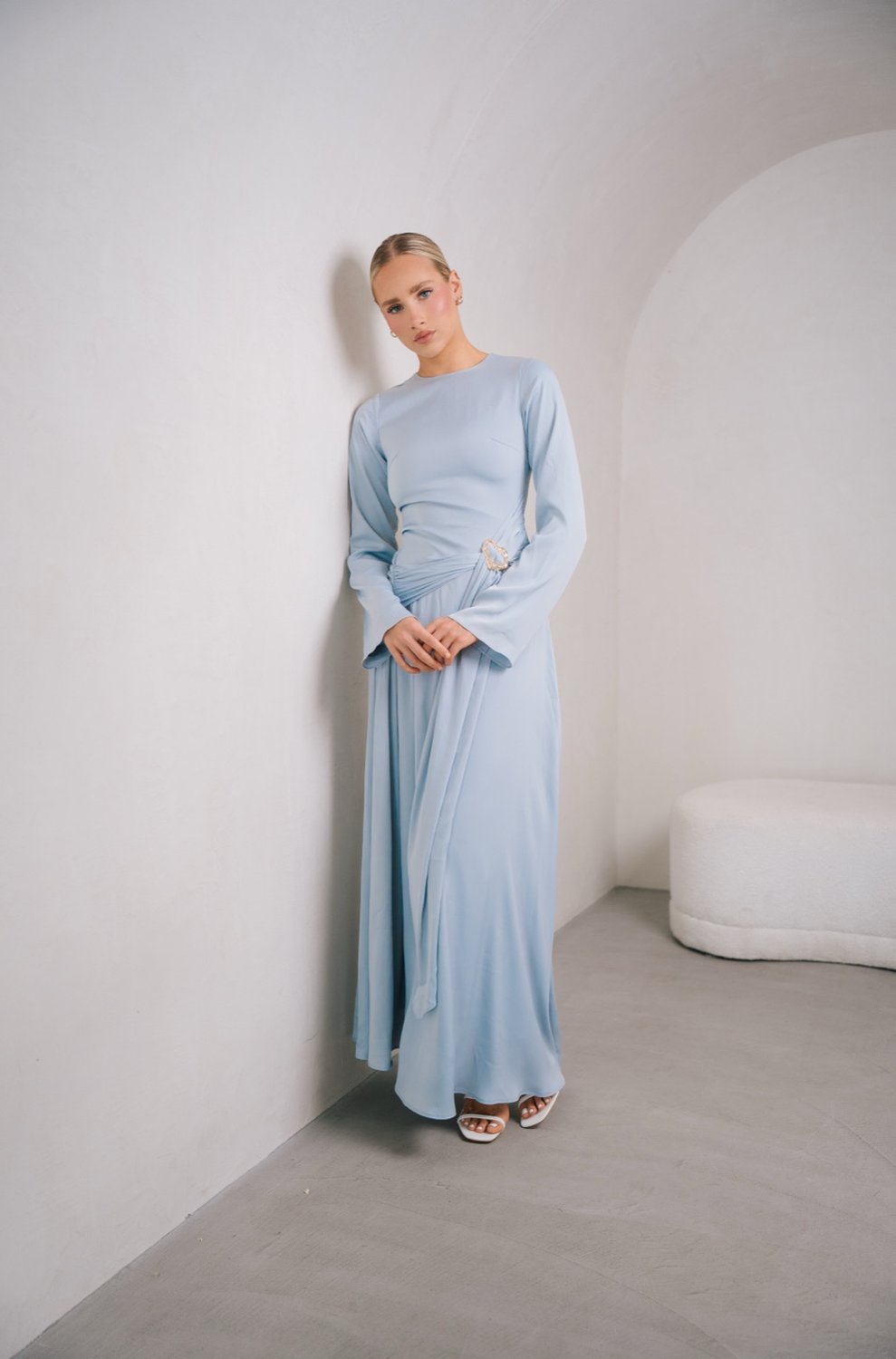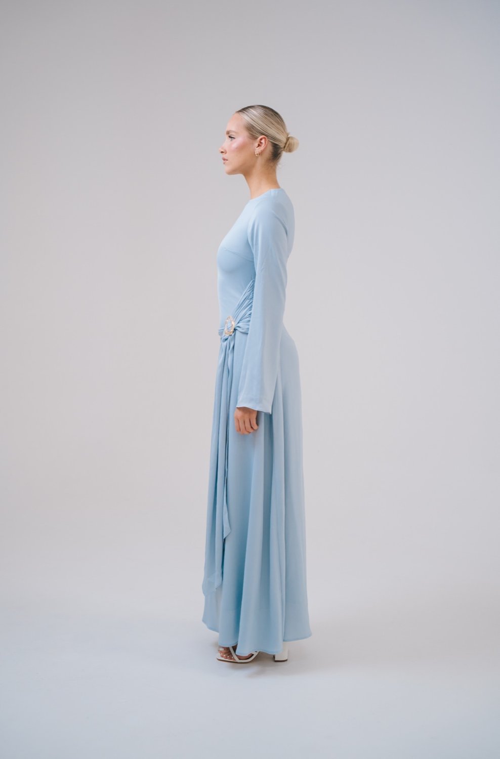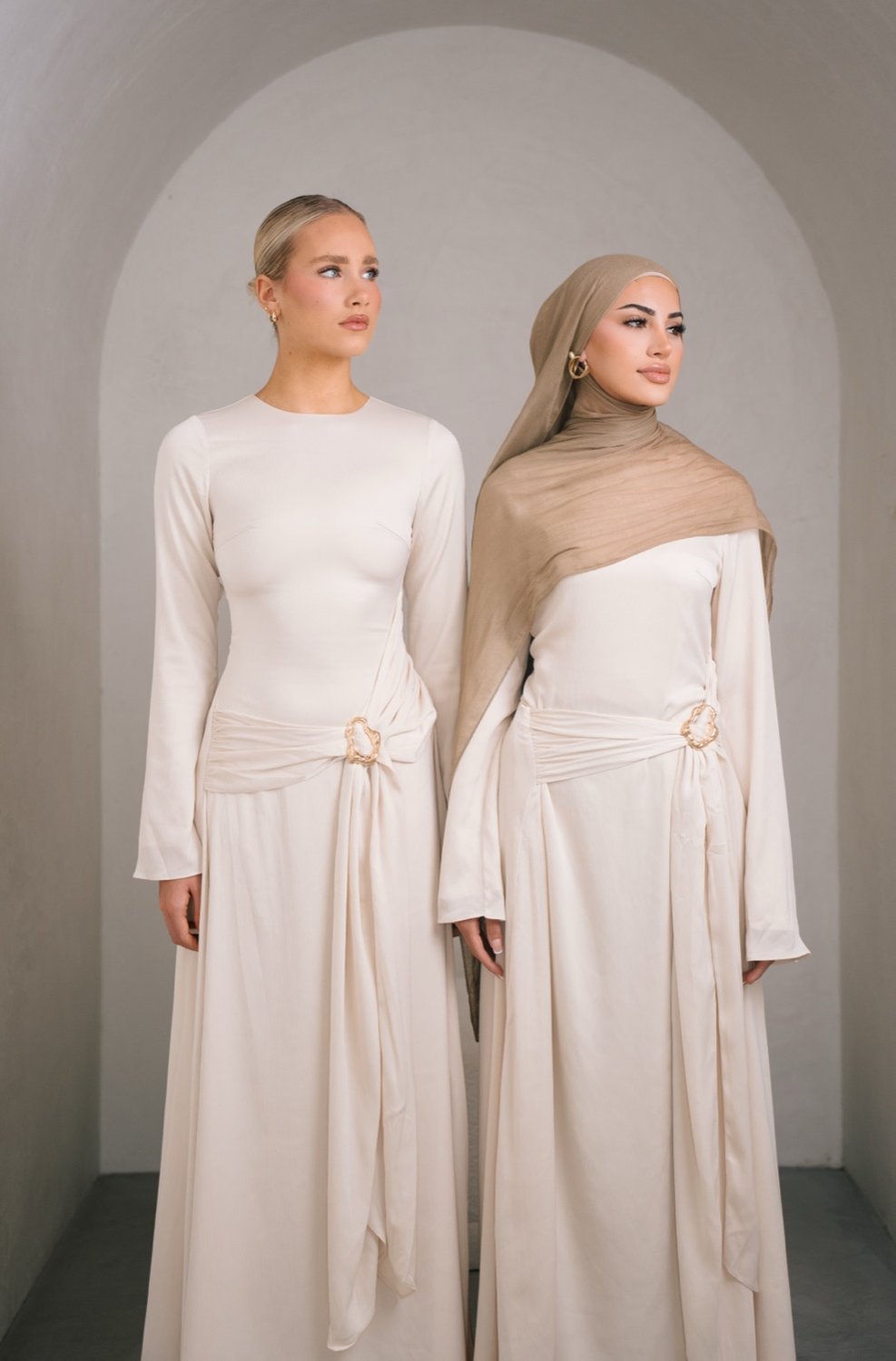 A signature gold sculptural brooch sits at the waist, allowing you to adjust the draped belt to your preferred fit — creating a fluid silhouette that flows all the way to the floor. This gown is fully opaque, fully lined, and designed to combine comfort with high-end elegance.