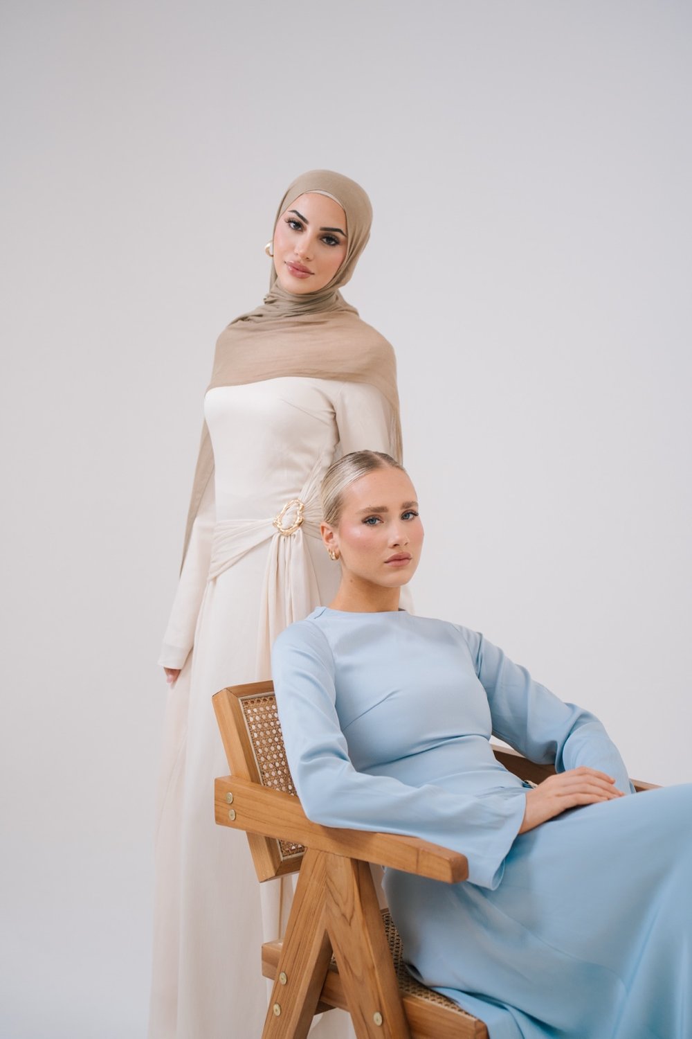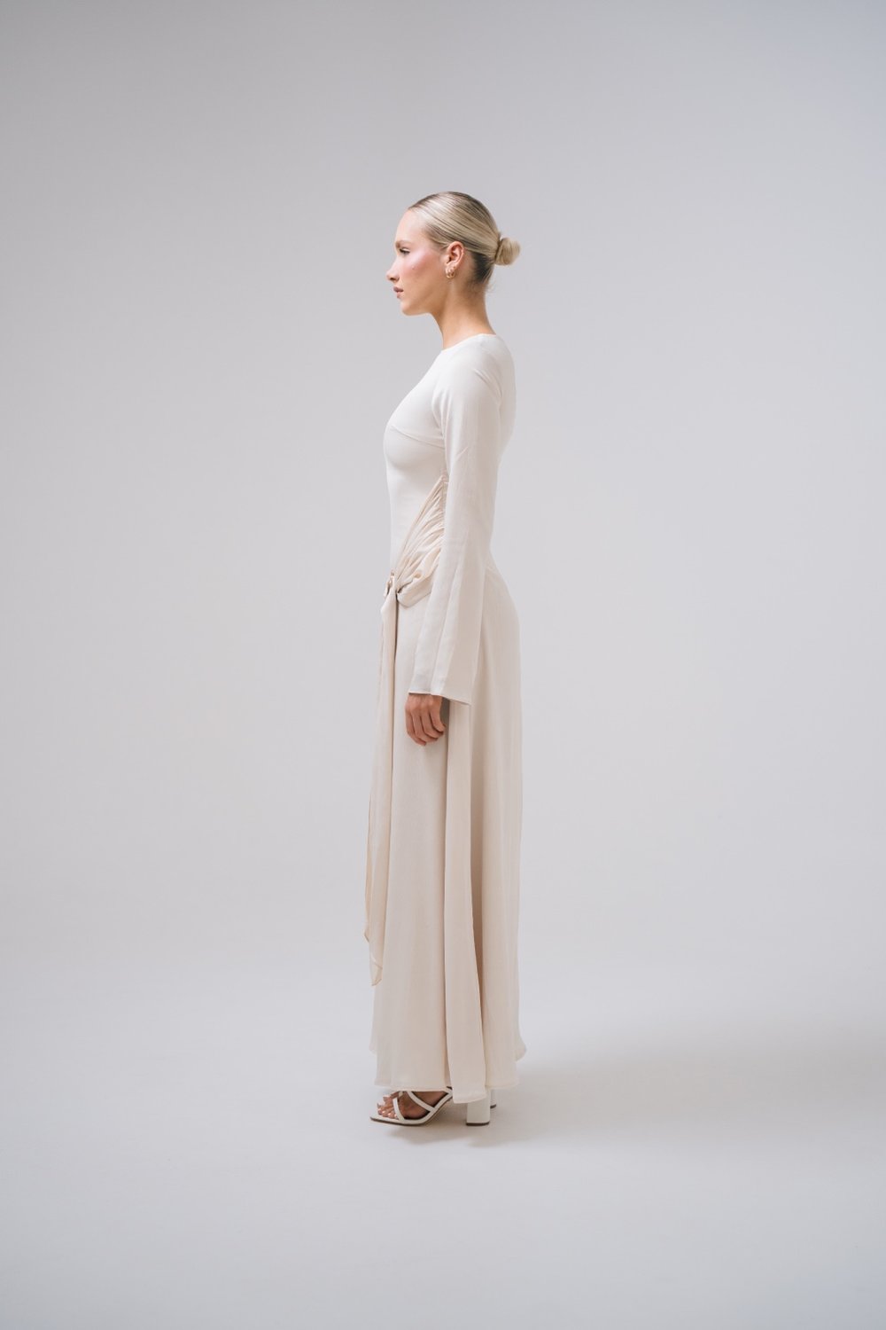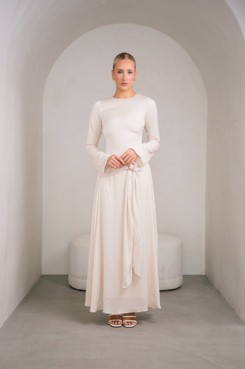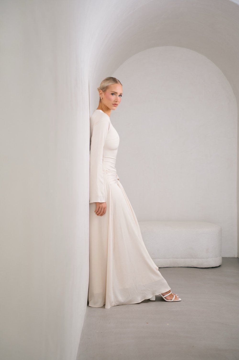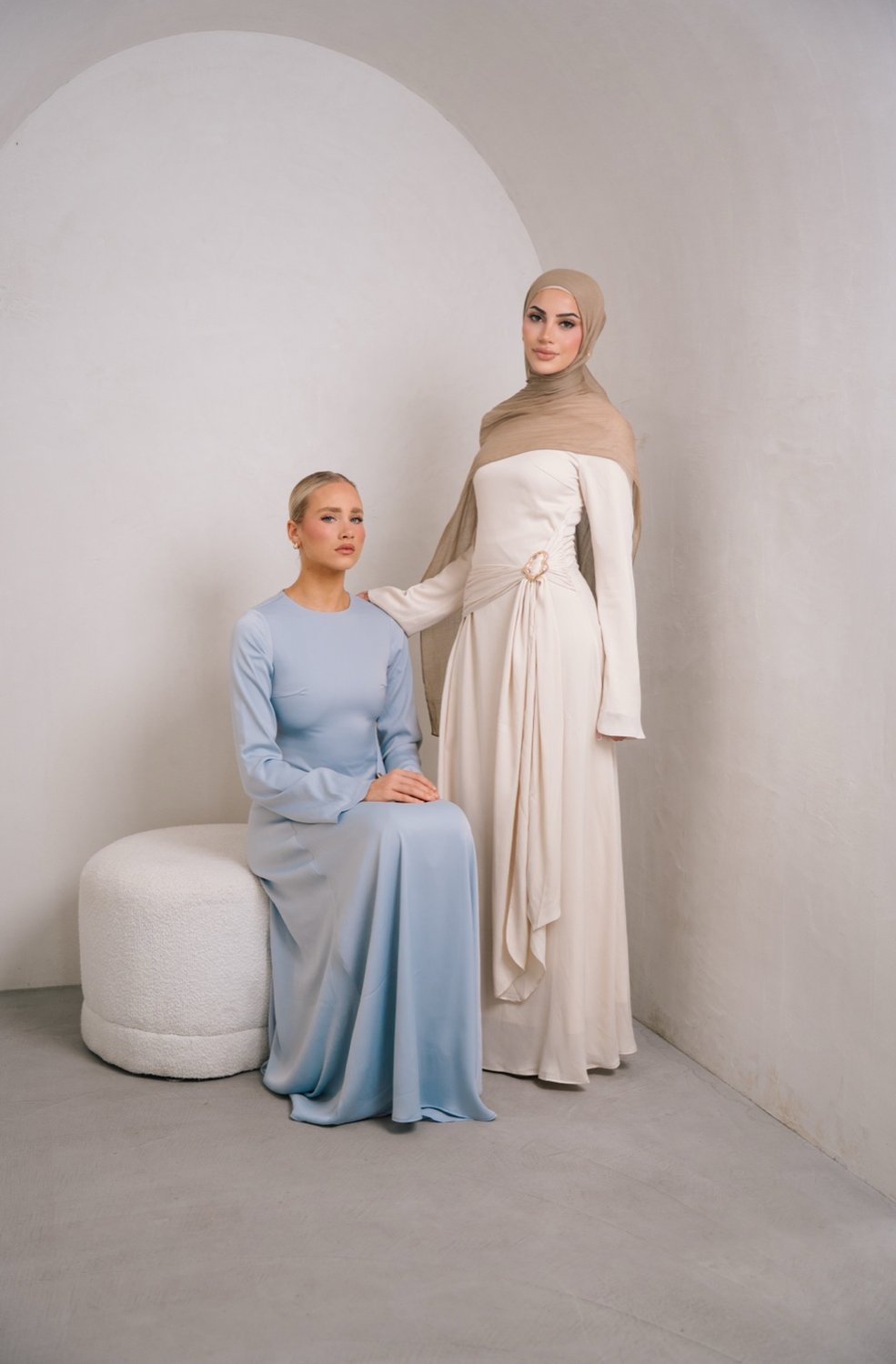 A signature gold sculptural brooch sits at the waist, allowing you to adjust the draped belt to your preferred fit — creating a fluid silhouette that flows all the way to the floor. This gown is fully opaque, fully lined, and designed to combine comfort with high-end elegance.