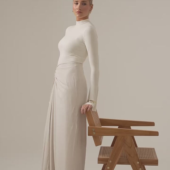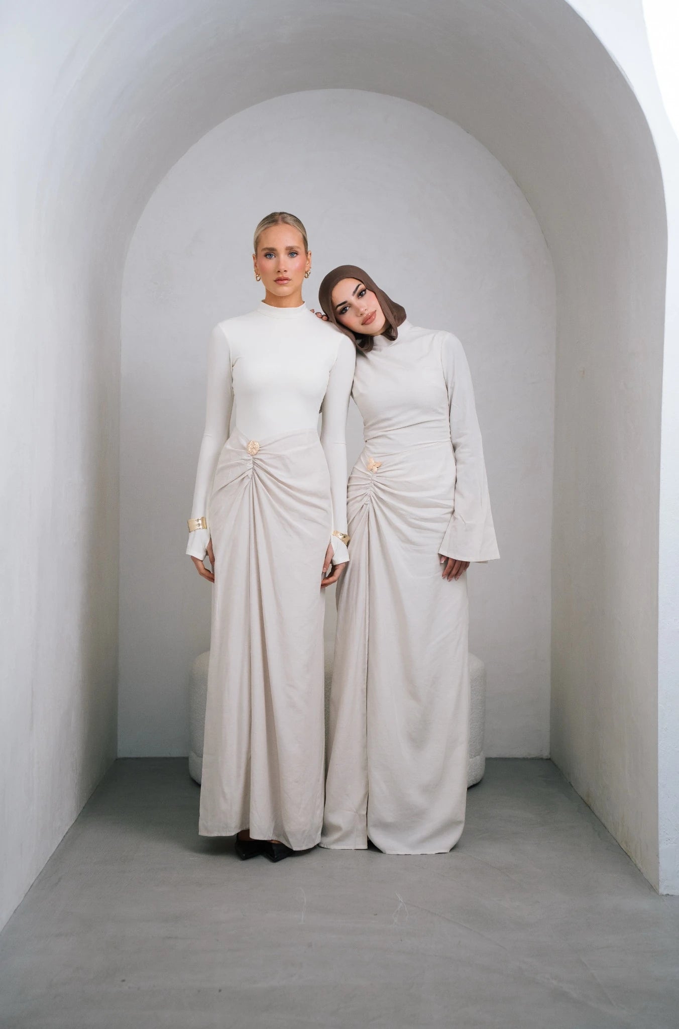 A fusion of softness and structure, the Odette Gown blends two premium fabrics into one timeless silhouette. The upper body is crafted from incredibly soft stretch jersey, designed to contour comfortably with subtle sheen. The skirt transitions into structured, high-grade linen, gathered into a sculptural drape secured by a detachable brooch at the hip.